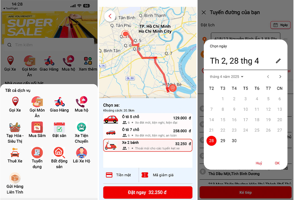 Bao gồm đa dịch vụ (gọi xe, ship hàng, đặt đồ ăn), giao diện tùy chỉnh, tích hợp thanh toán và định vị GPS, đa nền tảng.
