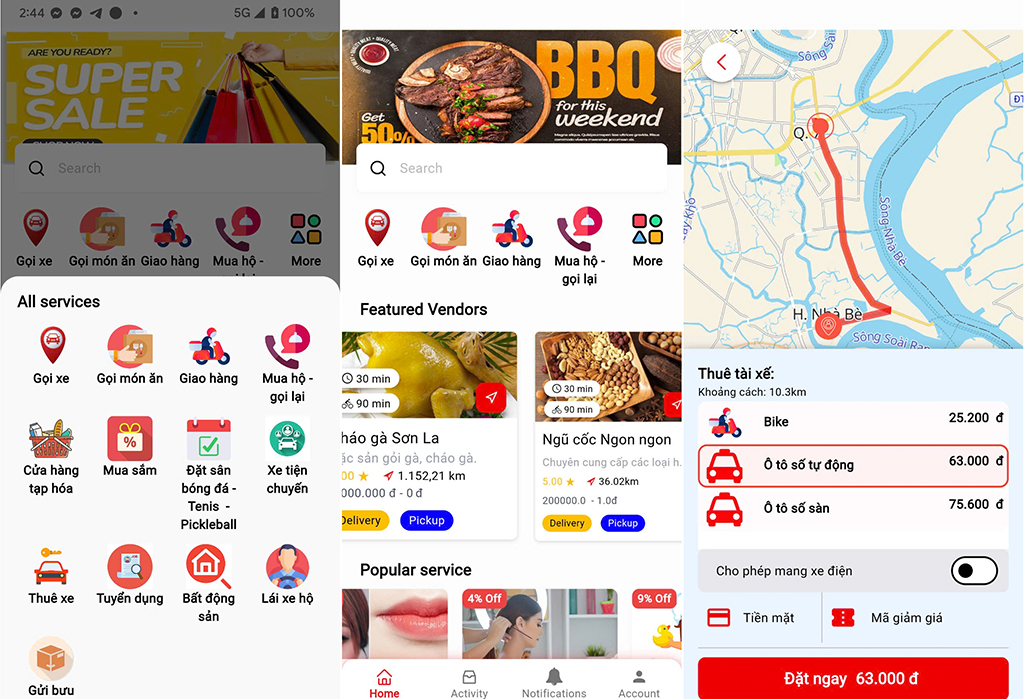 Đặt xe ôm, bạn uống tôi lái, hoặc gọi việc theo thời gian cụ thể (ví dụ: đón sân bay lúc 7h sáng).