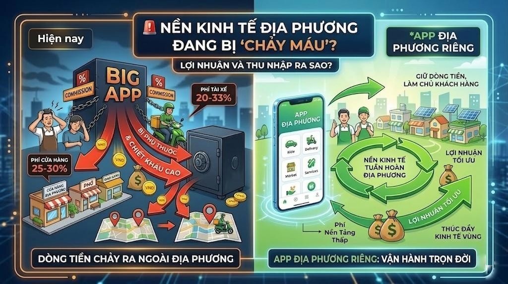 Chúng ta thường dễ dàng bỏ qua một sự thật tàn khốc đằng sau sự tiện lợi thường ngày: một cú chạm trên điện thoại để gọi tô phở nóng lúc tối muộn, hay đặt một cuốc xe ôm công nghệ để đi làm. Những giao dịch này tưởng chừng như đang thúc đẩy nội thương, nhưng thực tế, mỗi lần bạn đặt qua một ứng dụng lớn, một phần đáng kể dòng tiền – tài sản được tạo ra ngay tại địa phương – đang âm thầm rời khỏi quê hương bạn.