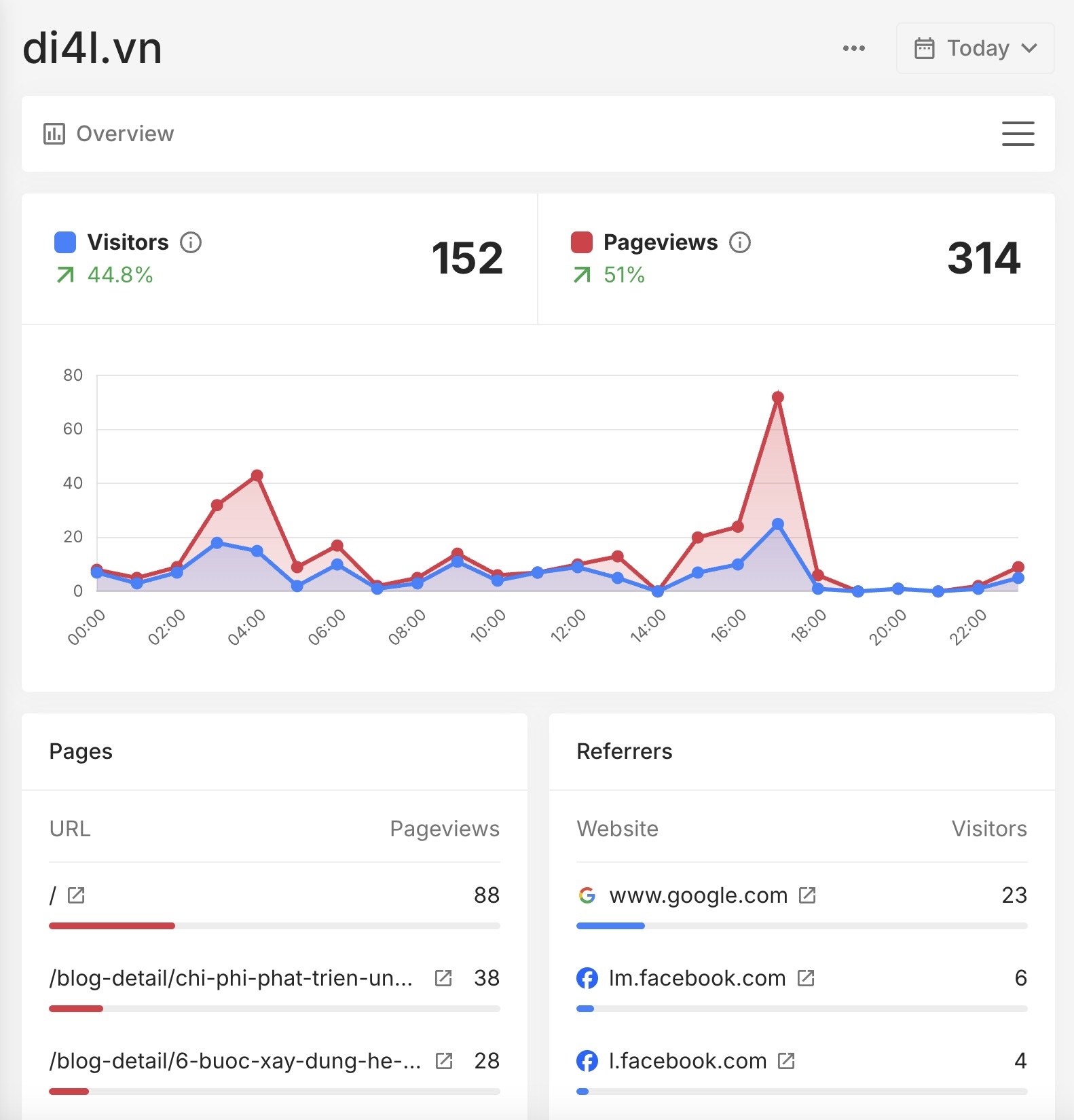 Phân tích tích hợp: Theo dõi Visitors, Pageviews, Pages, Referrers ngay trên dashboard.