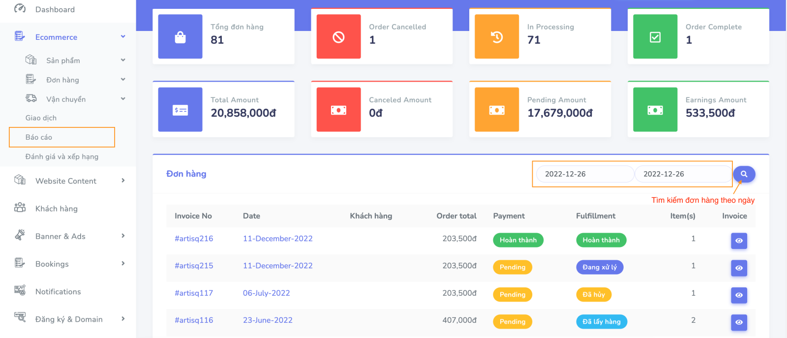 Để xem thông tin Báo cáo, ta vào mục " Ecommerce " -> " Báo cáo ", ta được bảng sau: