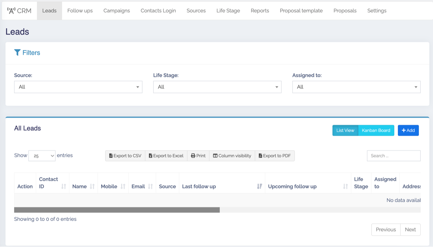 Để tạo thông tin khách hàng vừa thu thập được, ta vào CRM -> Leads -> Add.