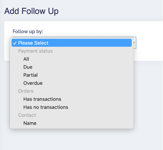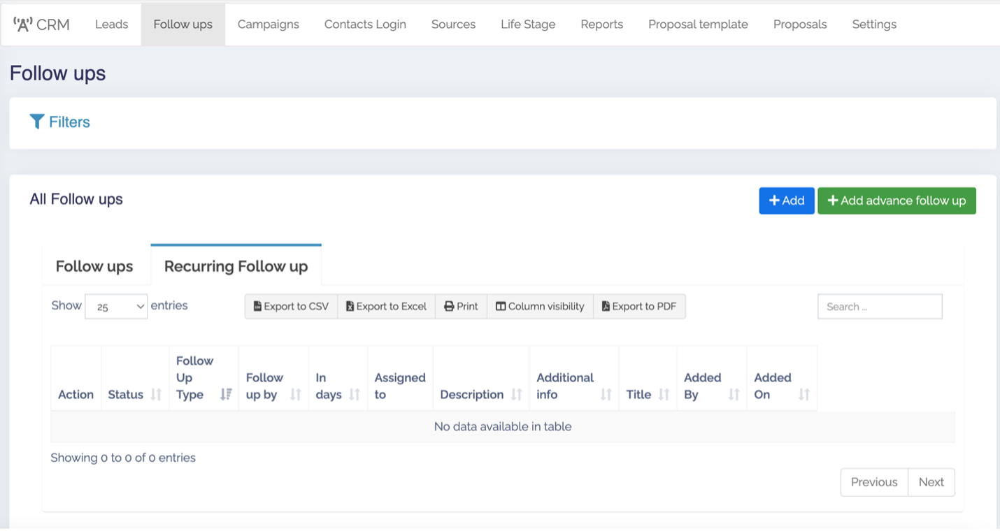 + Theo dõi 1 lần (One time follow up): vào CRM -> Follow ups -> Add advance follow up -> Add one time follow up