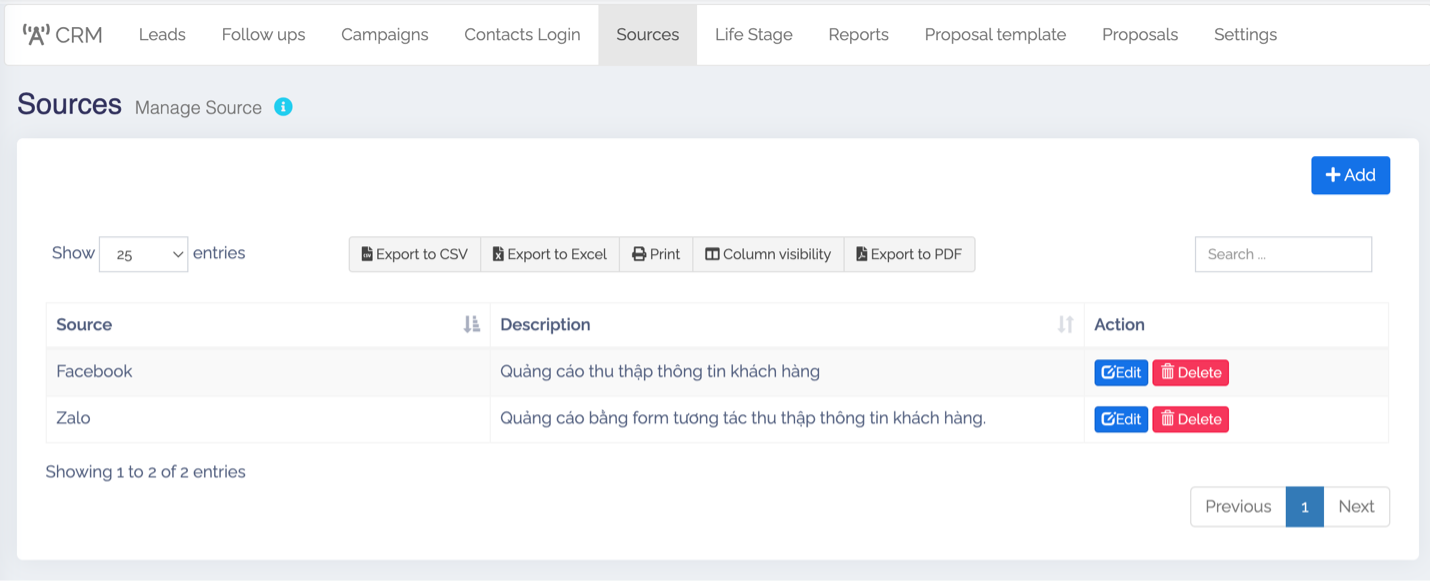 5. Sources (Nguồn thu thập thông tin khách hàng): CRM -> Sources