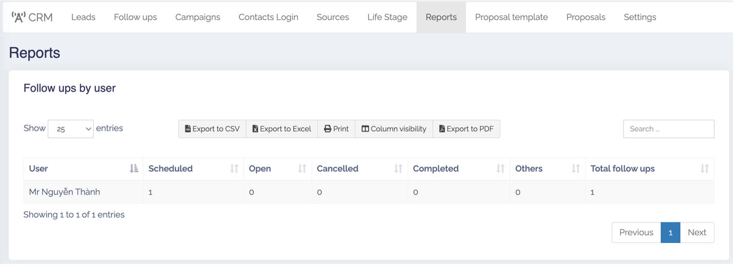 Bảng báo cáo về Số lượng Follow ups by user, by contact, tương tác với khách hàng tiềm năng.
