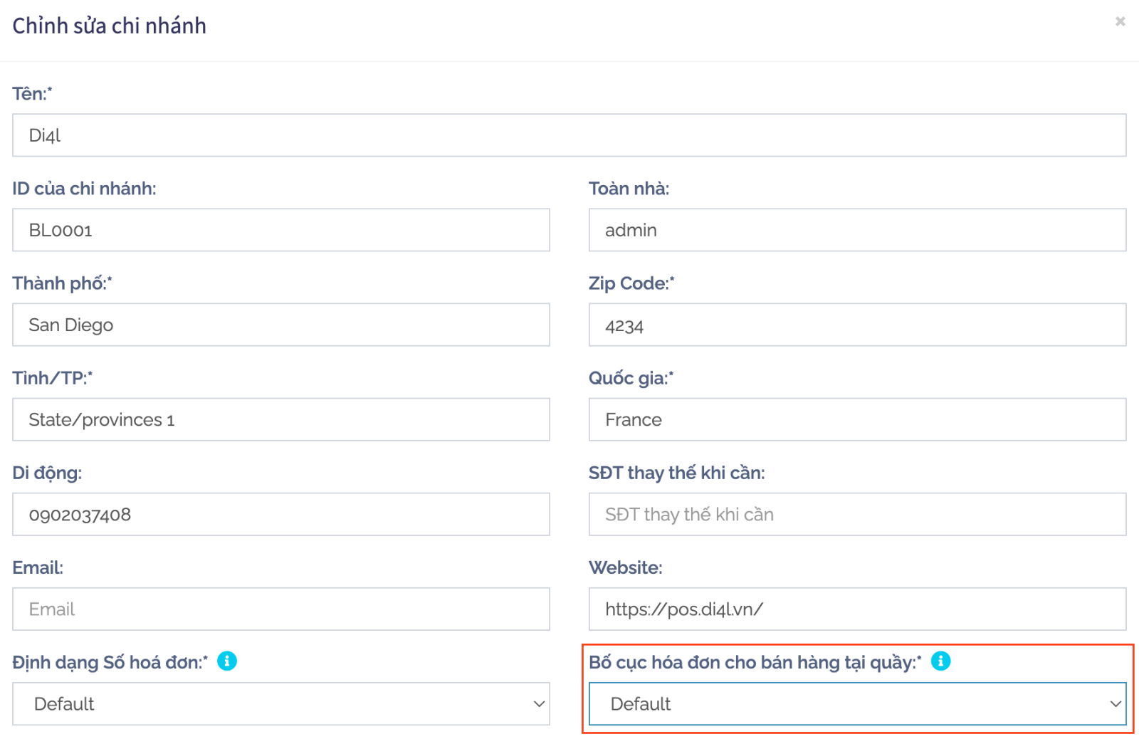 Trong mục chỉnh sửa chi nhánh, bạn chọn tuỳ chọn ‘Bố cục hoá đơn cho bán hàng tại quầy’, bạn chọn mũi tên xuống để chọn bố cục hoá đơn mới tạo và nhấn nút Lưu.