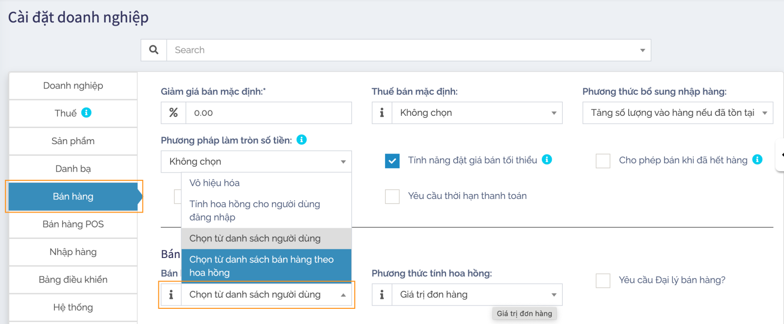 Từ màn hình ‘Cài đặt Doanh nghiệp’ -> ‘Bán Hàng’ -> ‘Bán hàng theo hoa hồng’: