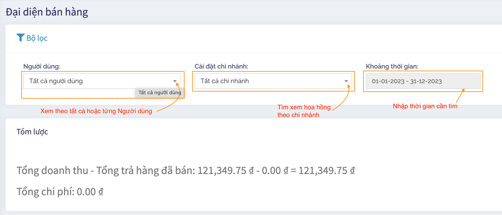 Để xem số tiền hoa hồng, bạn vào mục “ Báo cáo” -> “Đại diện bán hàng”: