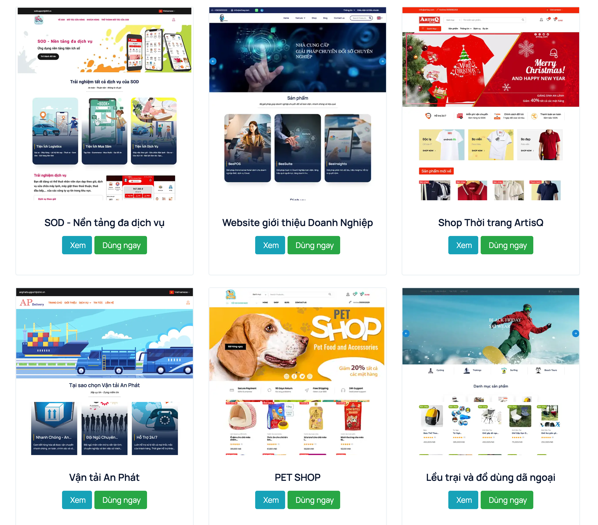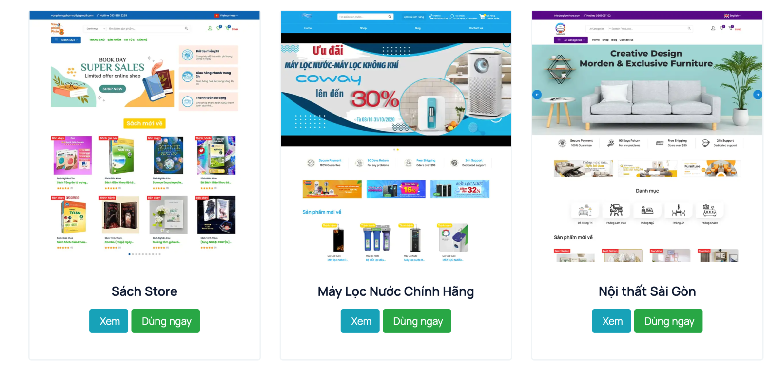 Hiển thị danh sách website bán hàng mẫu, bạn có thể tham khảo mẫu website bạn thấy phù hợp với nhu cầu về định dạng, cách trình bày sản phẩm,… Mình lưu ý bạn nên quan tâm layout hiển thị, bố cục website, nếu có website mẫu cùng sản phẩm với cửa hàng bạn đang kinh doanh càng tốt, vì bạn có thể dễ dàng thay đổi theo sản phẩm của mình trong trang quản trị trang web (Web Admin).