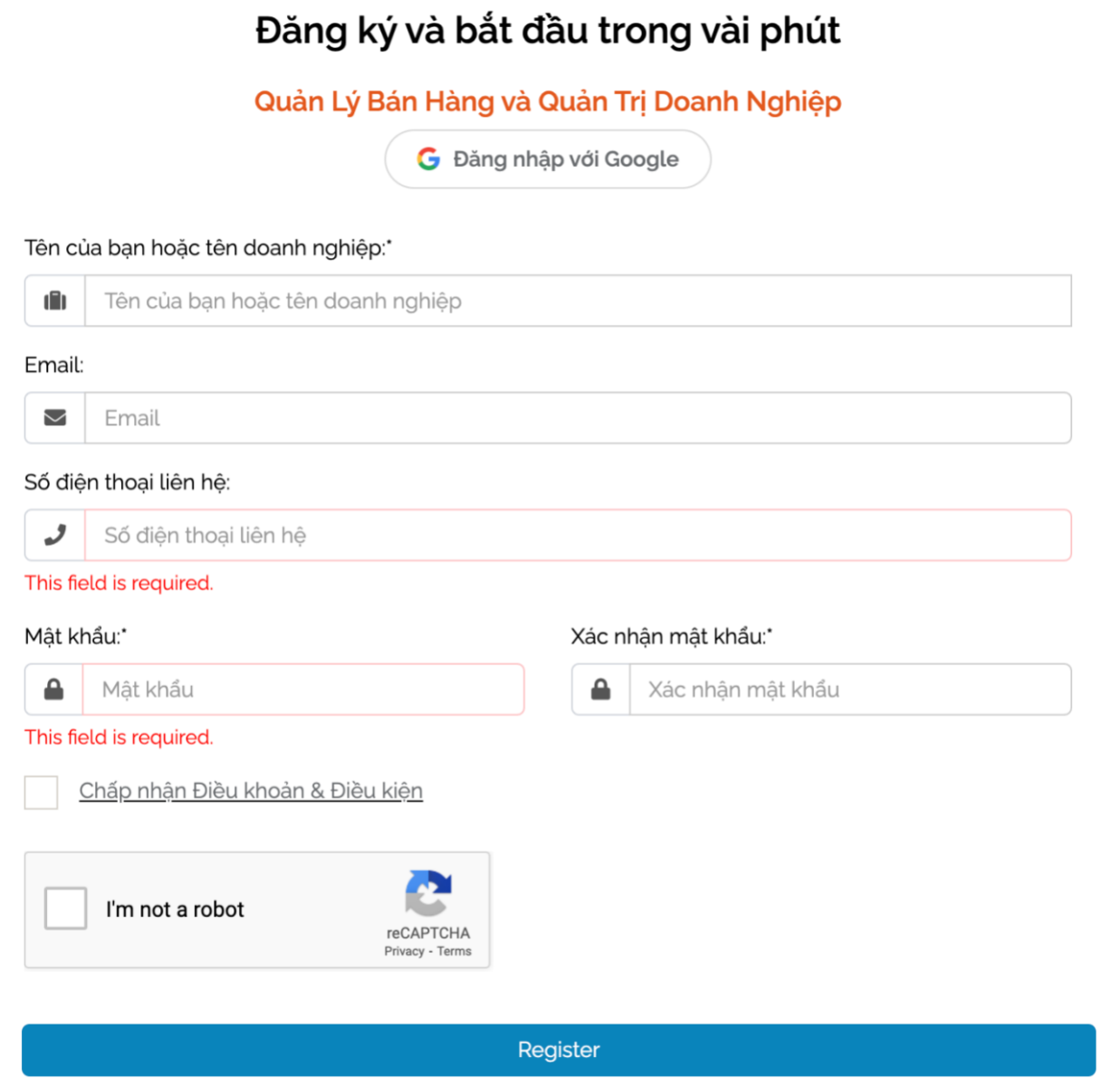 + Điền tất cả thông tin trong bản, sau đó nhấn vào 2 điều kiện “Chấp nhận Điều khoản & Điều kiện” và “I’m not a robot”. Sau đó, nhấn nút “Register” -> sẽ vào màn hình sau: