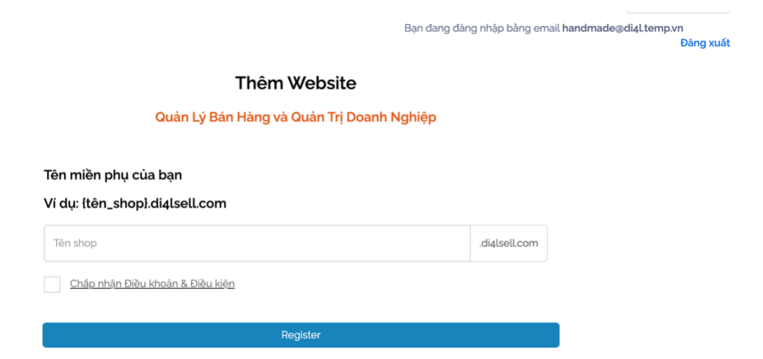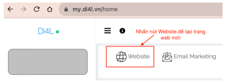 Để tạo trang web bán hàng, bạn nhấn vào nút Website được tô đỏ ở màn hình trên -> sẽ xuất hiện màn hình đăng kí tên miền cho wesbite. Do bạn đang sử dụng miễn phí nên sử dụng domain: di4lsell.com. Tên miền không thể thay đổi cho nên bạn nên lựa chọn tên miền phù hợp với mục đích kinh doanh và sản phẩm đang bán. Sau này nếu bạn có mong muốn thay đổi tên miền riêng, bạn có thể liên hệ di4l.vn để được hỗ trợ.