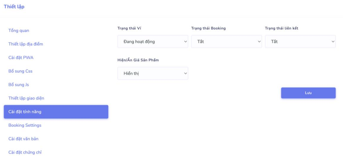 - Cài đặt tính năng: cho phép bật/tắt các tính năng như: ví, booking, hiện/ẩn giá sản phẩm.