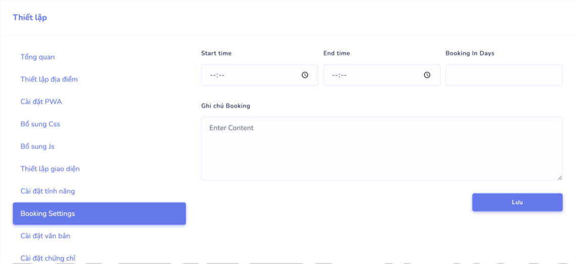 - Booking Settings: Nếu bạn có nhu cầu mở tính năng cho khách hàng book lịch đối với các spa, nhà hàng…, bạn vào Booking Settings, chọn thời gian bắt đầu và kết thúc booking,…
