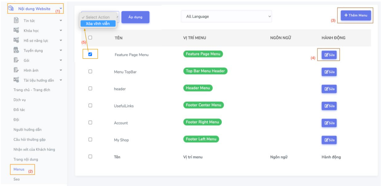 (5): Xoá menu, khi thực hiện xoá không thể khôi phục lại. Bạn chỉ có thể tạo lại menu mới.