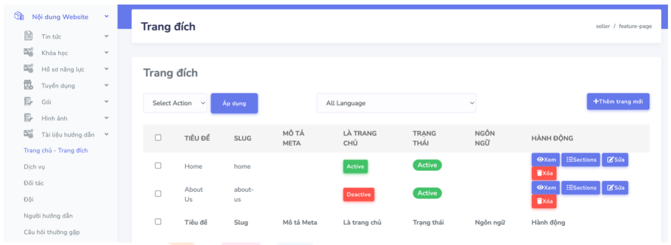 + Sections: thay đổi, cập nhật các thành phần sẽ hiển thị trong trang đó.