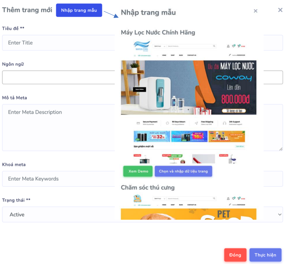 Nhấp vào nút “Nhập trang mẫu” sẽ hiển thị ra các trang chủ mẫu, bạn có thể chọn 1 mẫu trang yêu thích. Những section nào mà dữ liệu trong website của bạn có sẵn sẽ được điền vào, những section không có dữ liệu sẽ được import vào giống như giao diện trang chủ bạn chọn.