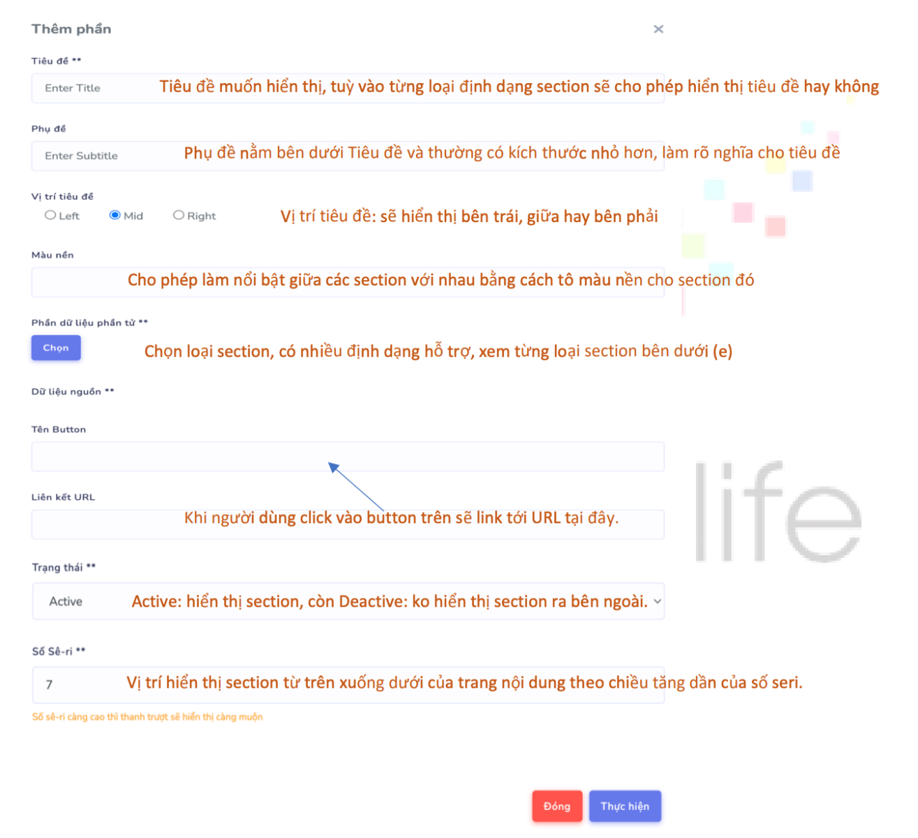 Ta được màn hình bên dưới, xem giải thích bên cạnh các trường trong màn hình thêm section: