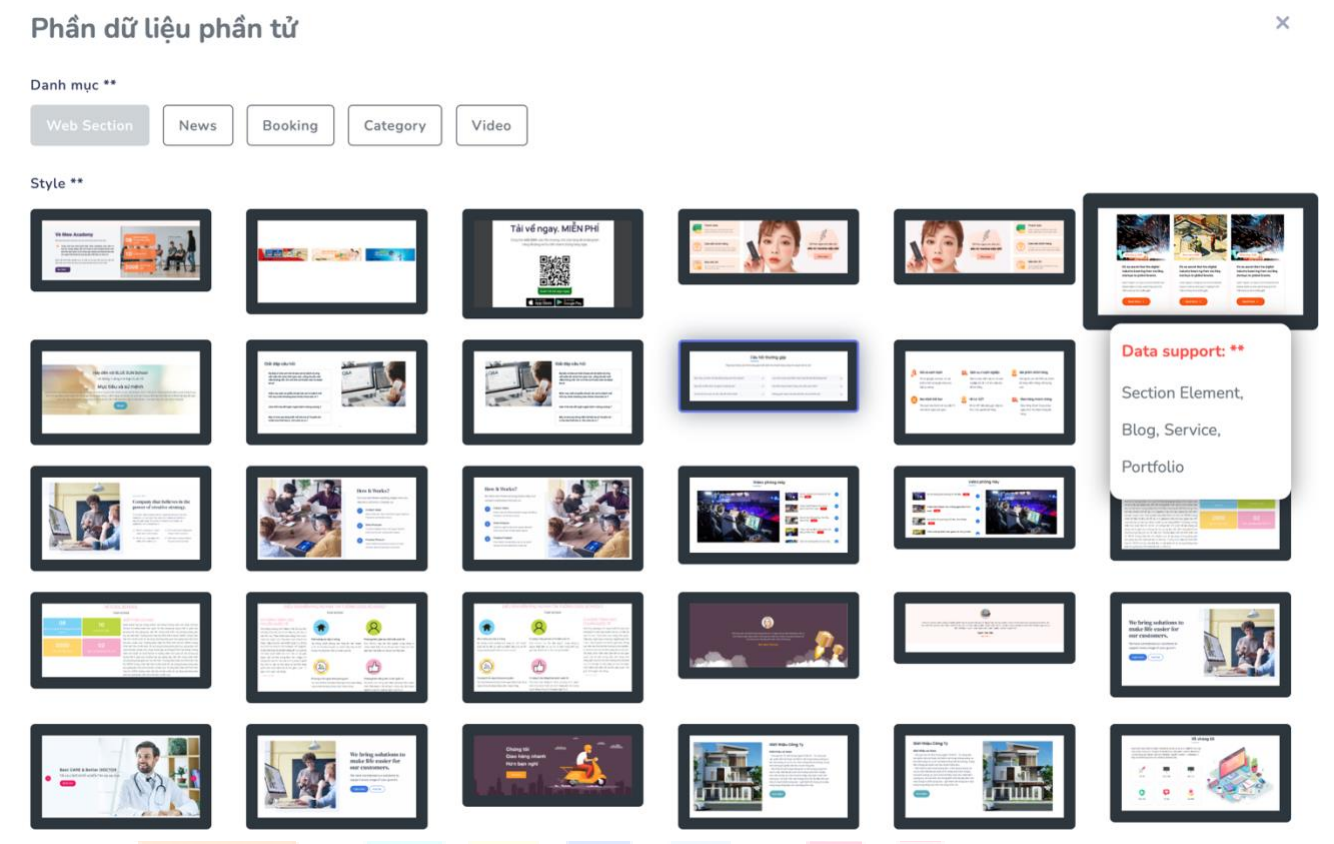 o Web section: tất cả sections ở đây đều có thể được dùng được cho các danh mục khác như: News, Booking, Category, Video.
