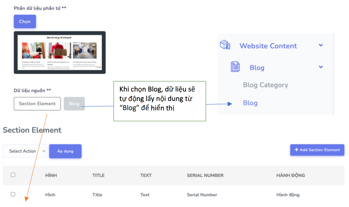 Nếu dữ liệu nguồn là “Section Element” thì bạn sẽ tự tạo dữ liệu bên dưới bằng cách nhấp vào nút “Add Section Element”.