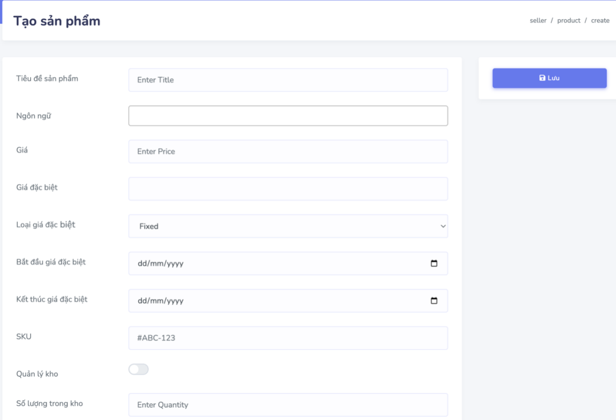 + SKU: được xem như trường định danh cho sản phẩm (mã này là duy nhất và không được trùng), dùng để đồng bộ sản phẩm giữa các sàn giao dịch sau này.
