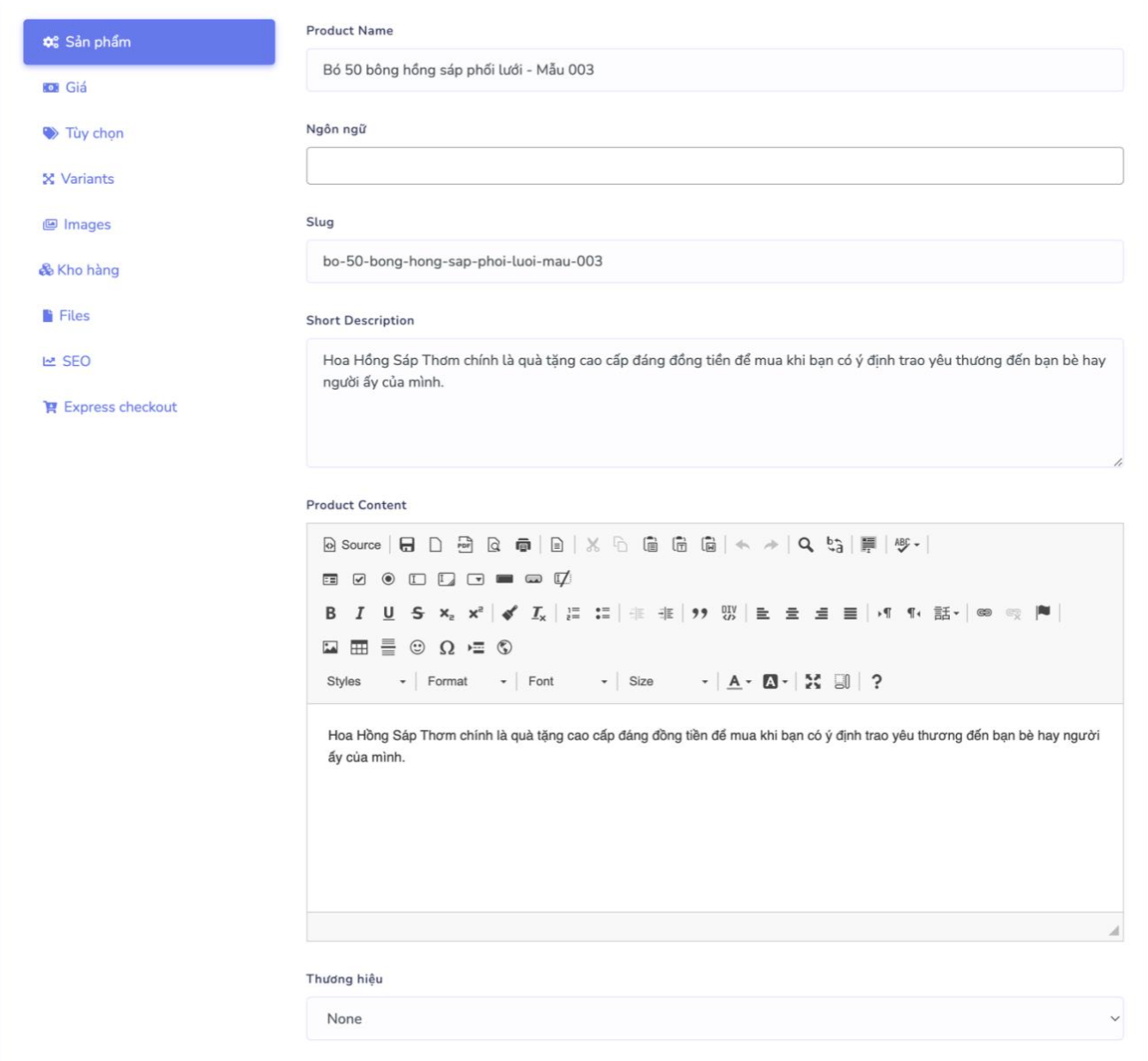 - Thương hiệu: Chọn thương hiệu cho sản phẩm (nếu có).