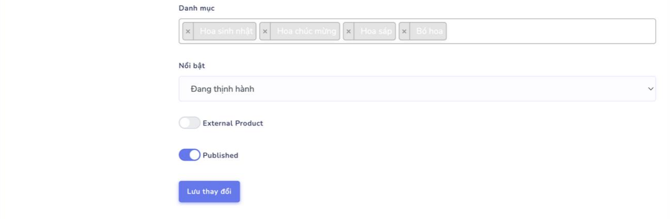 - Published: nếu bật thì sản phẩm sẽ được hiển thị ra ngoài cho khách hàng lựa chọn, ngược lại sản phẩm ở thư mục tạm.