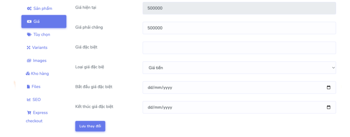 + Giá đặc biệt: số tiền giảm giá ( ko phải số tiền sau khi giảm). Ví dụ: Giá sản phẩm đăng bán: 250.000vnđ, bạn muốn trong tháng 10 giảm giá còn 200.000vnđ, thì giá đặc biệt là: 50.000vnđ.