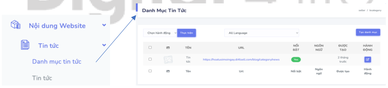 a. Tạo danh mục tin tức: vào mục Nội dung Website -> Tin tức -> Danh mục tin tức: