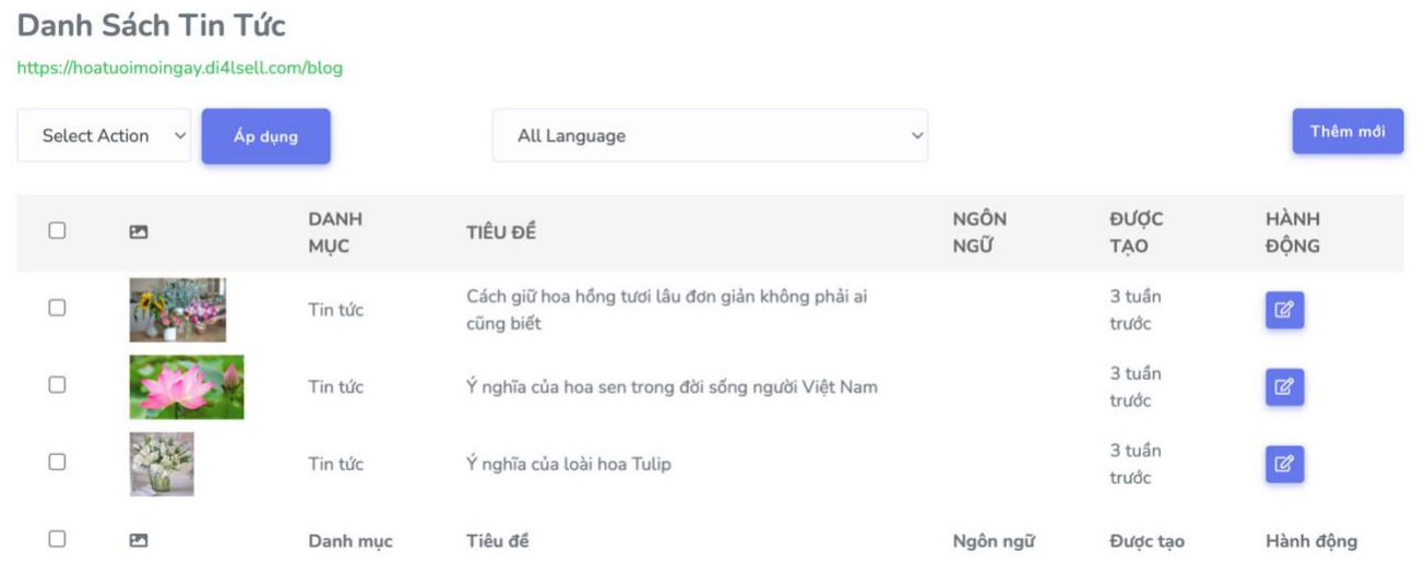 b. Tạo tin tức: vào mục Nội dung Website -> Tin tức -> Tin tức, ta được danh sách tin tức như hình:
