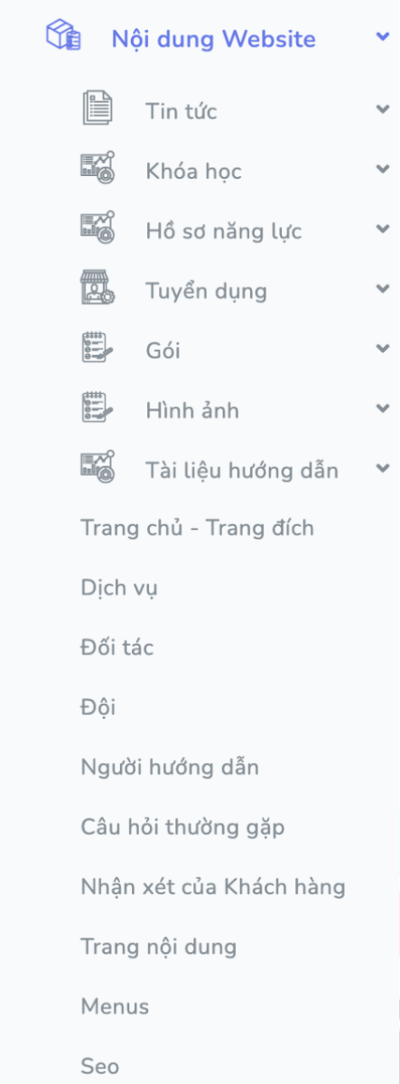 Tương tự các phần hướng dẫn ở trên, với mục đích mong muốn tạo ra Khoá học, Tuyển dụng,… Bạn có thể vào mục “Nội dung Website” và tìm tên tương ứng, với những tiêu đề rất dễ hiểu. Bạn chắc chắn sẽ làm được.