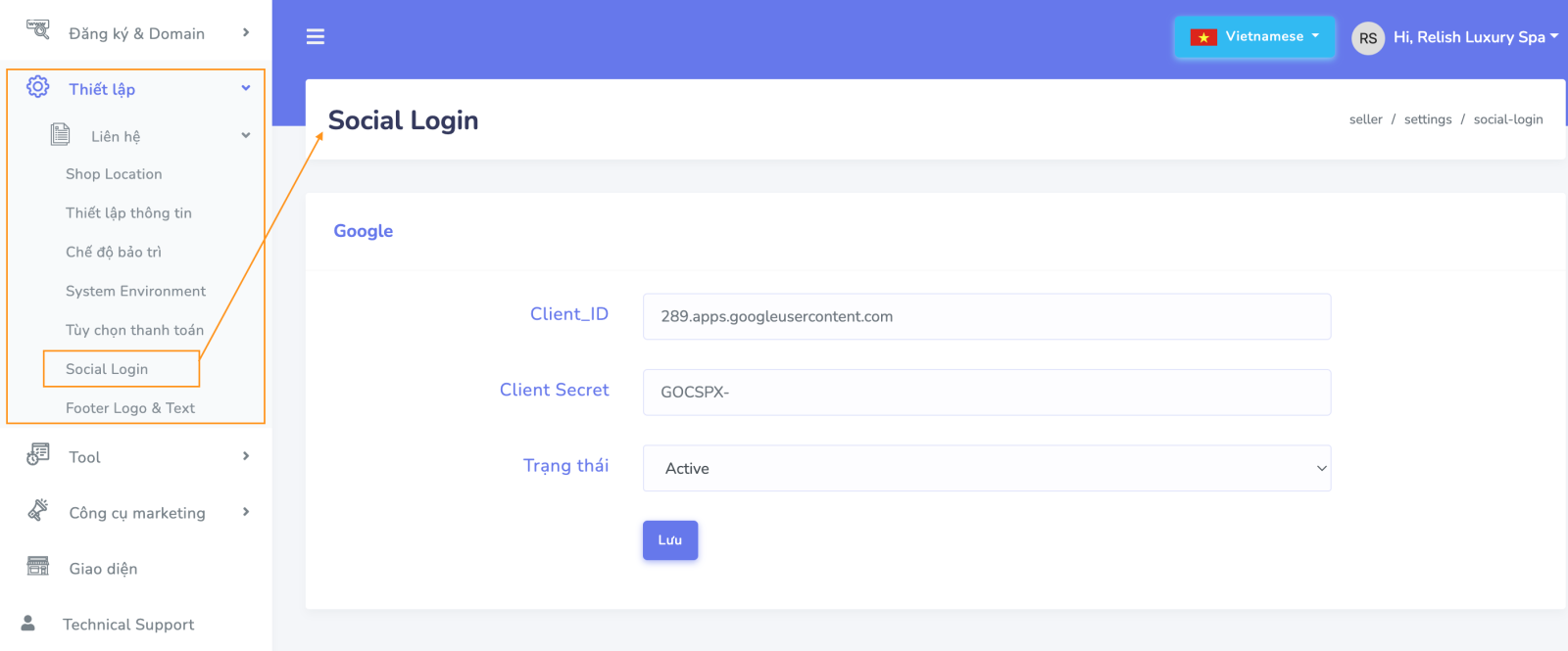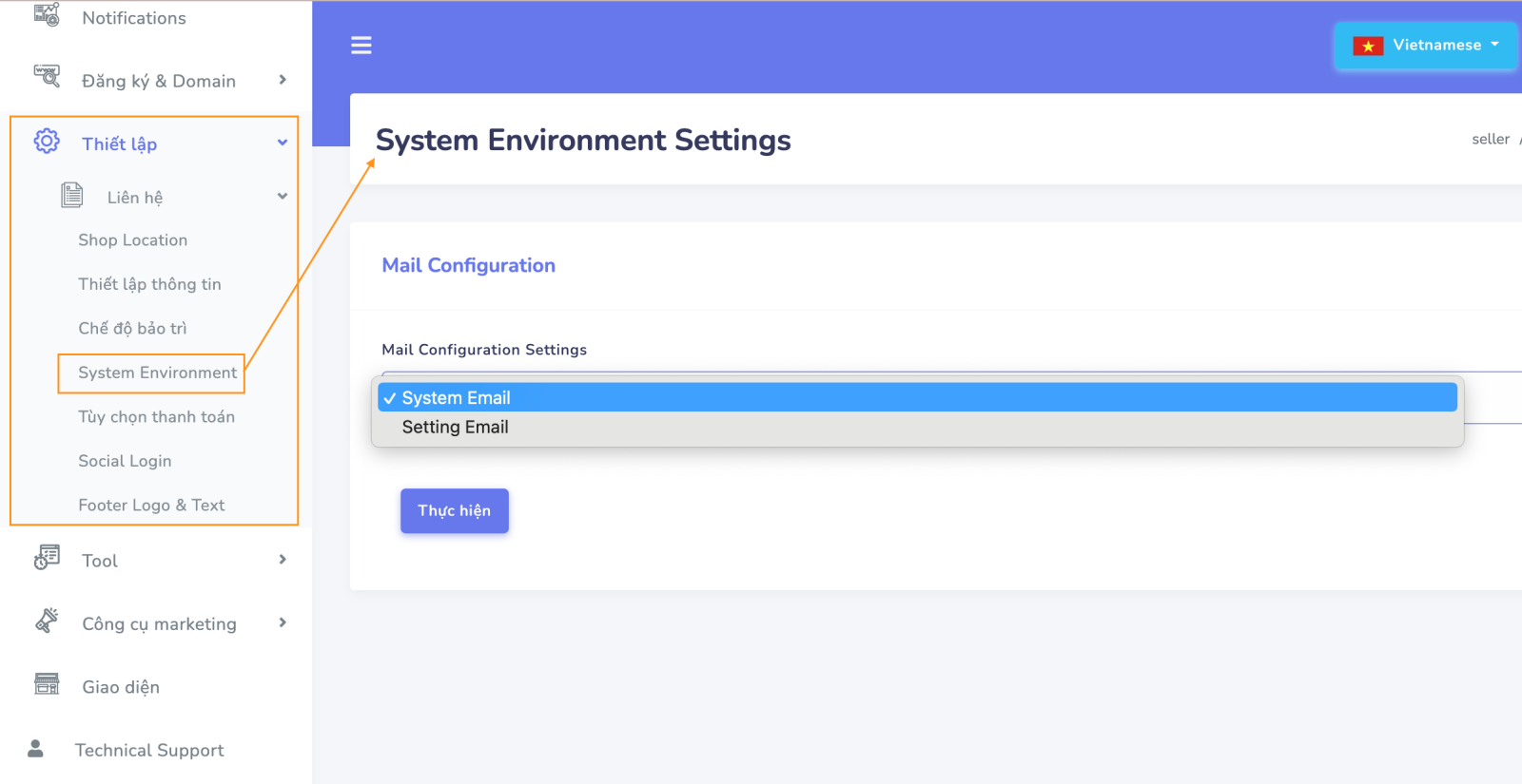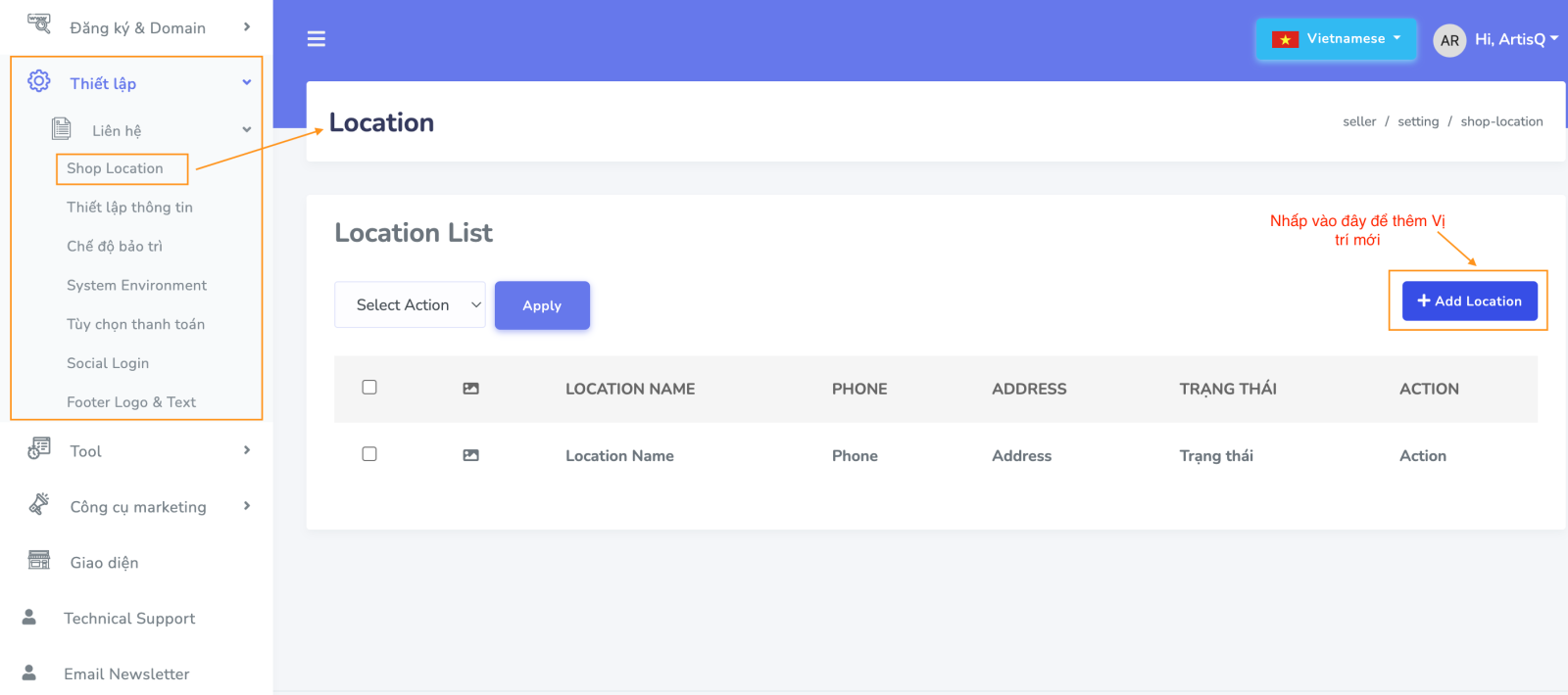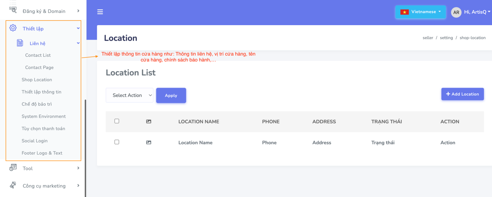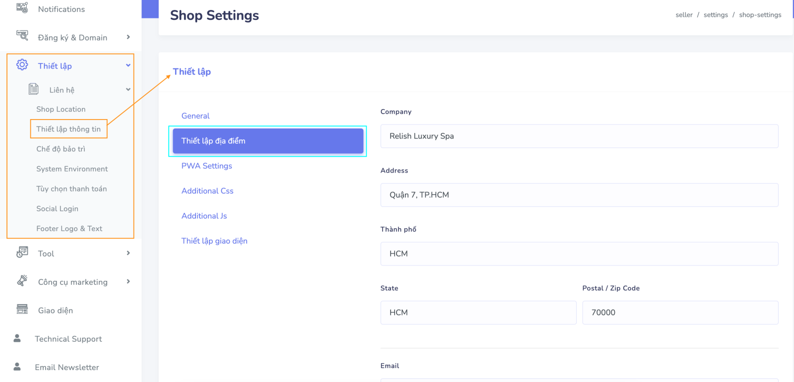 Để thiết lập thông tin cửa hàng, bạn chọn "Settings" or "Thiết lập", có giao diện như sau:
