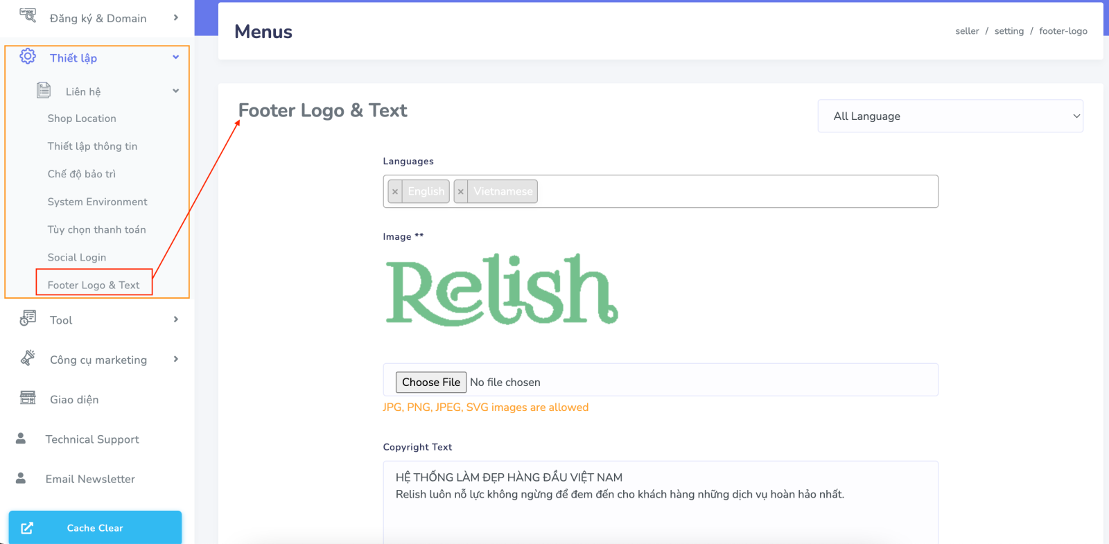 - Languages: thiết lập ngôn ngữ được hỗ trợ trên website