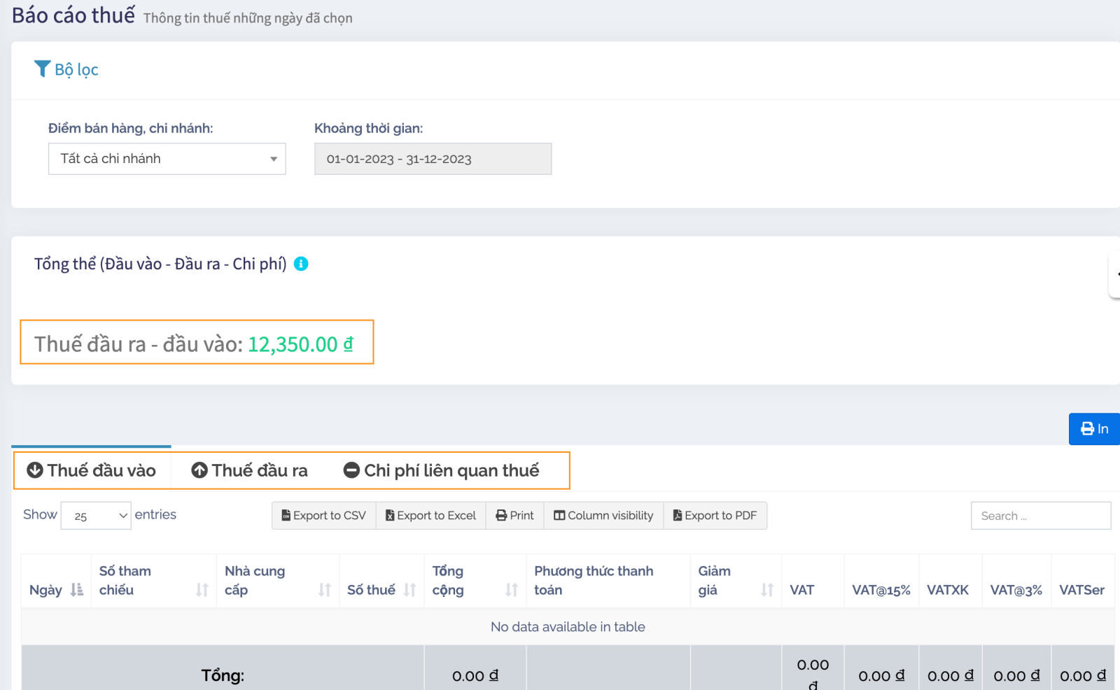Cho bạn biết tổng thuế đầu ra, tổng thuế đầu vào: