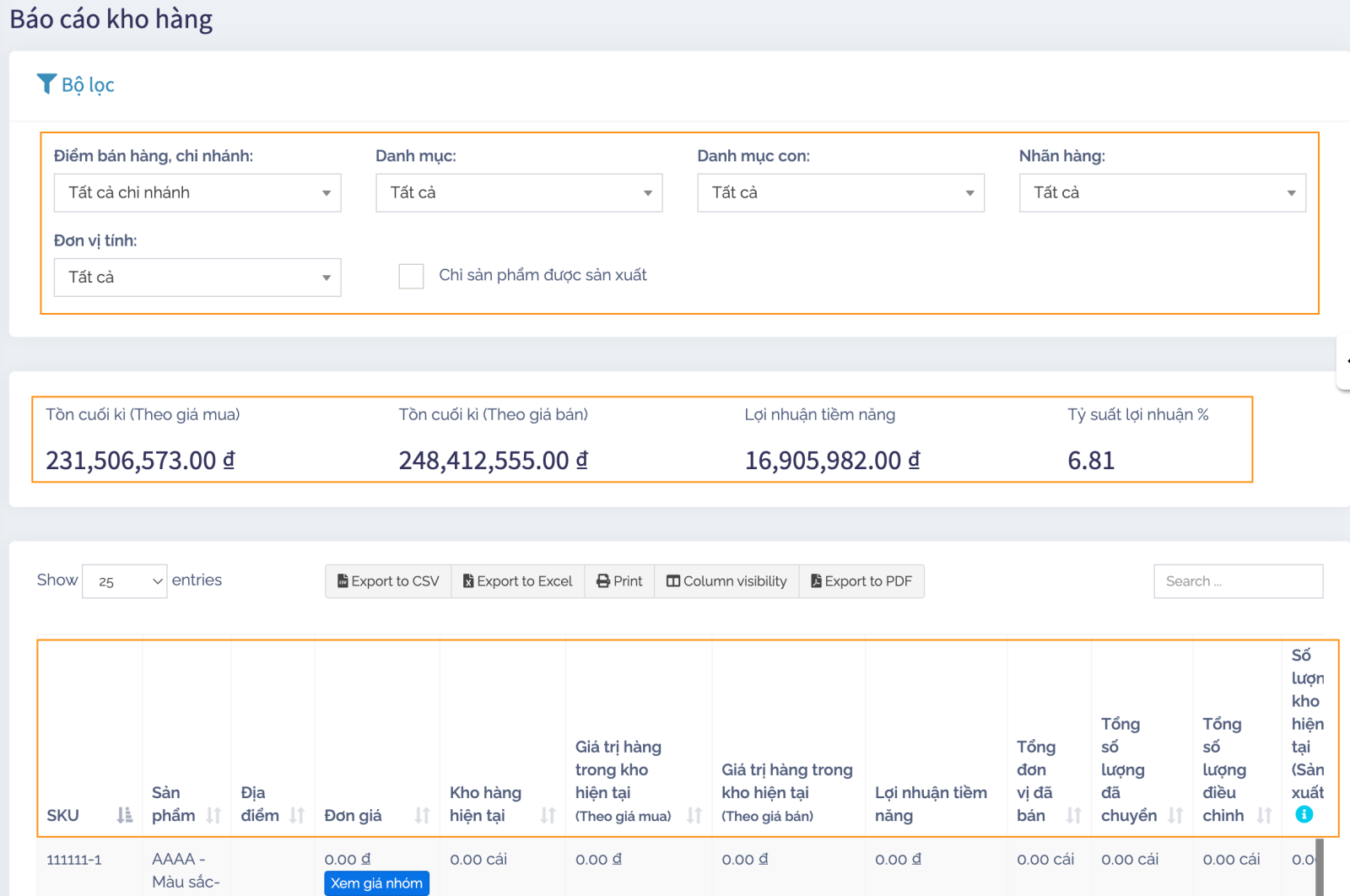 Báo cáo kho hàng