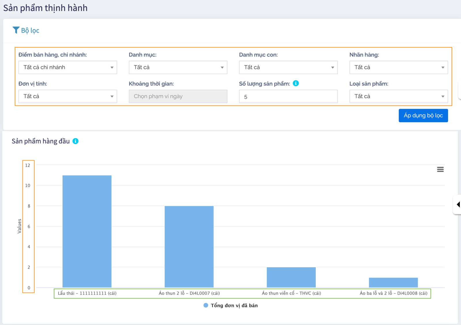 + Chọn Danh mục sản phẩm, Danh mục con, Nhãn hiệu, Đơn vị, Phạm vi ngày để lọc sản phẩm.