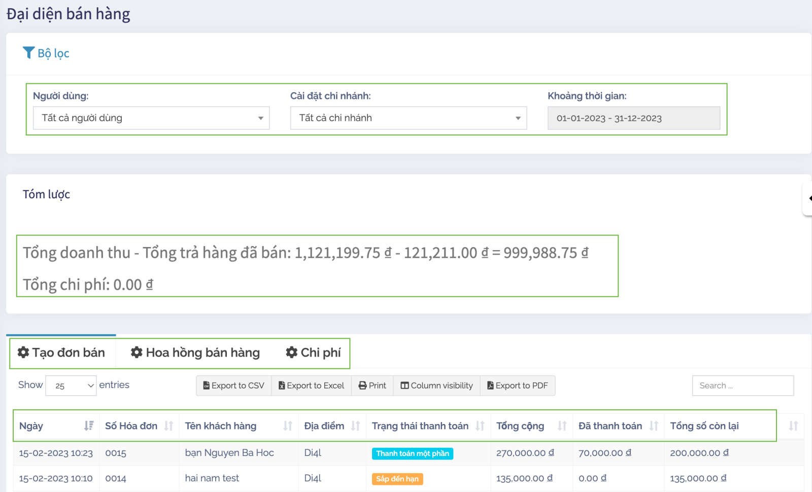 Xem chi tiết Doanh số và Chi phí của Đại diện bán hàng