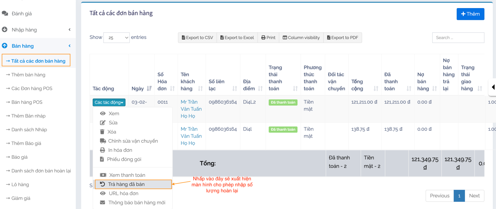 Cách 2: Vào mục Bán hàng -> Tất cả đơn hàng, chọn hành động trả hàng trên mỗi đơn hàng cần trả, như hình dưới: