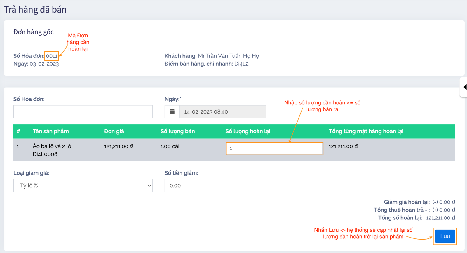 Cách 1: Chỉnh sửa hóa đơn bán hàng hiện có bằng cách vào chỉnh sửa hóa đơn và xóa sản phẩm hoặc giảm số lượng sản phẩm. Và lưu nó. Hệ thống sẽ tự động cộng số lượng bị trả về kho. Đây là một cách làm đơn giản và được khuyên dùng.