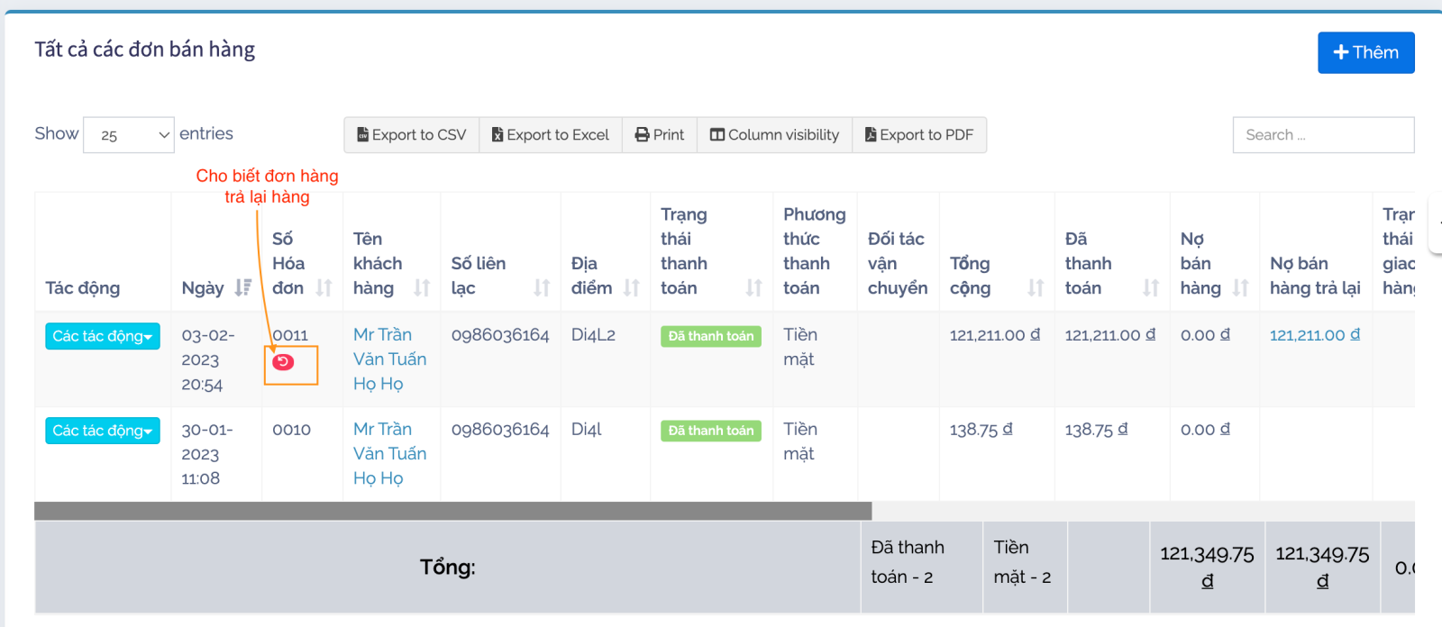 Quay trở lại danh sách bán hàng, bạn nhận thấy đơn hàng cần trả hàng có thêm kí hiệu giúp bạn nhận biết đơn hàng nào trả lại: