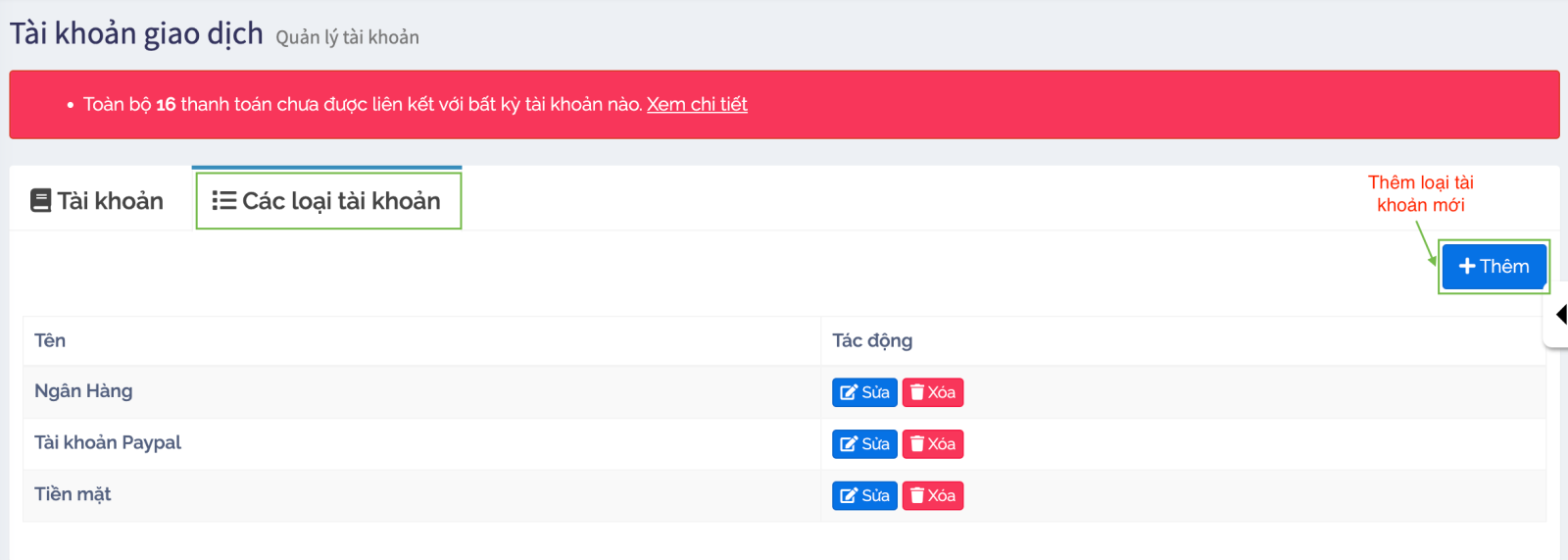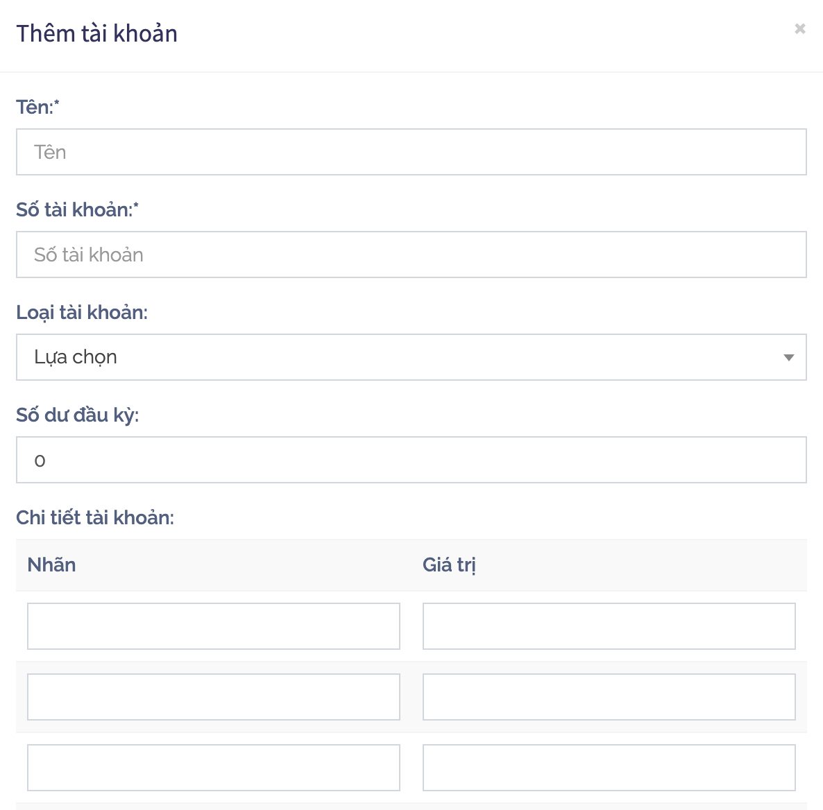 + Thêm loại tài khoản mới: bạn nhấp vào nút Thêm -> xuất hiện màn hình thêm như sau: