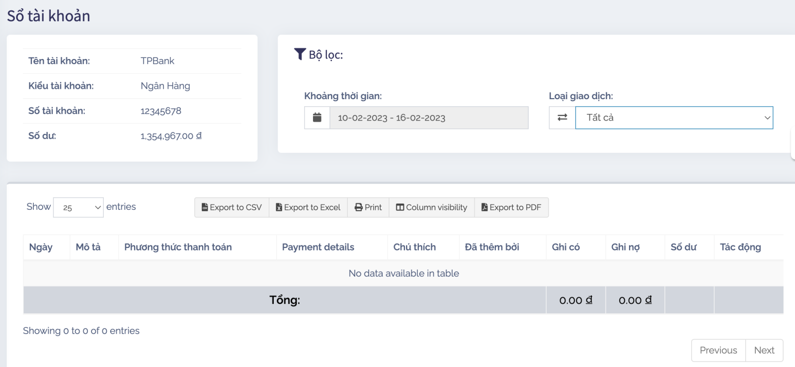 Để xem các giao dịch của tài khoản, bạn chọn ‘Sổ tài khoản’ phía bên phải của mỗi tài khoản:
