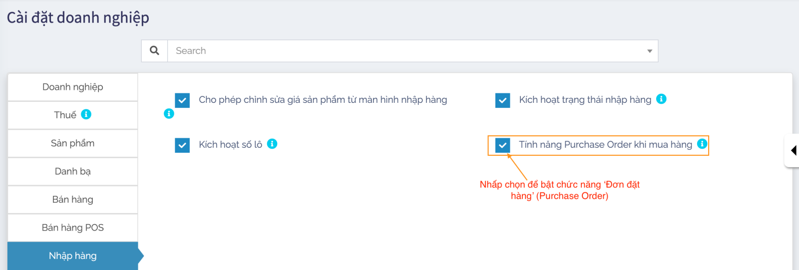 + Vào thẻ Nhập hàng -> Nhấp chọn tuỳ chọn ‘Tính năng Purchase Order khi mua hàng’