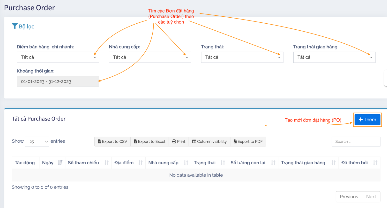 Khi bạn chọn Purchase Order (PO) bạn sẽ thấy màn hình sau: