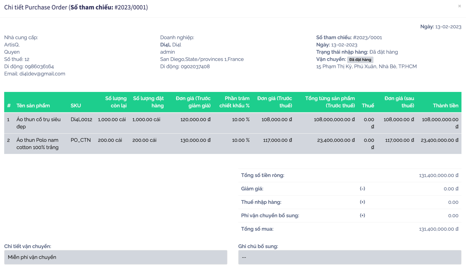 Sau đó, nhấn ‘Lưu’ để lưu thông tin và tạo Đơn đặt hàng. Bạn sẽ thấy Purchase Order (Đơn đặt hàng) đã được tạo và nhấp PO bạn sẽ thấy chi tiết PO như hình dưới: