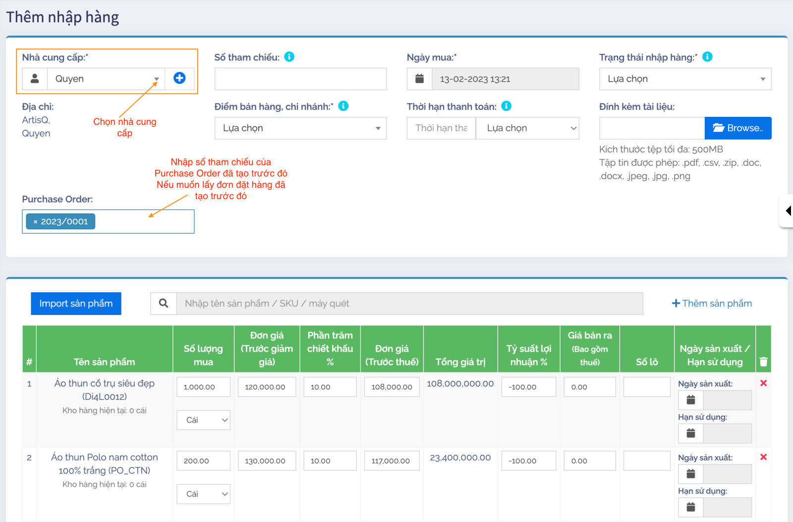 + Chọn nhà cung cấp (mà bạn đã tạo đơn đặt hàng)