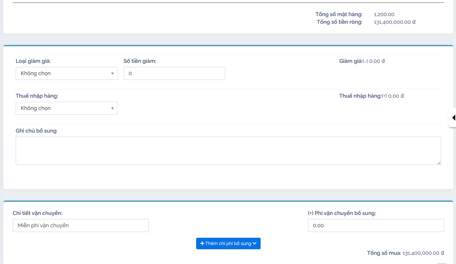 Để thêm Purchase Order (Đơn đặt hàng) mới, bạn nhấn nút Thêm, bạn cần điền đầy đủ các thông tin yêu cầu như hình dưới: