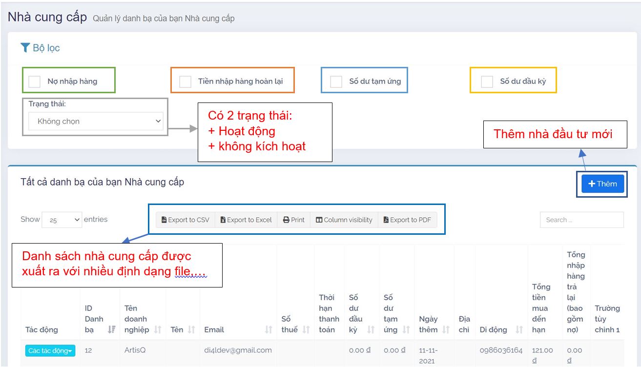 2. Có thể xem tất cả danh bạ của nhà cung cấp thông qua bộ lọc (Filter) như:
