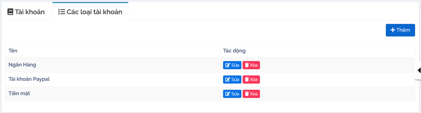 - Nhấn vào nút "Thêm" để tạo loại tài khoản mới: