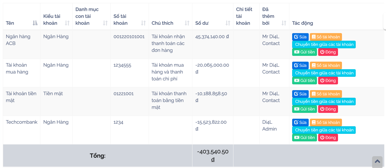 - Sửa: cho phép chỉnh sửa thông tin tài khoản bao gồm: tên, số tài khoản,