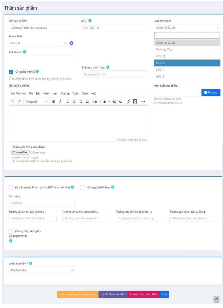 + SKU: là mã duy nhất được dùng để định danh sản phẩm và in mã vạch. Nếu trong quá trình thêm sản phẩm, bạn để trống trường này thì chương trình sẽ tự phát sinh SKU giúp bạn.